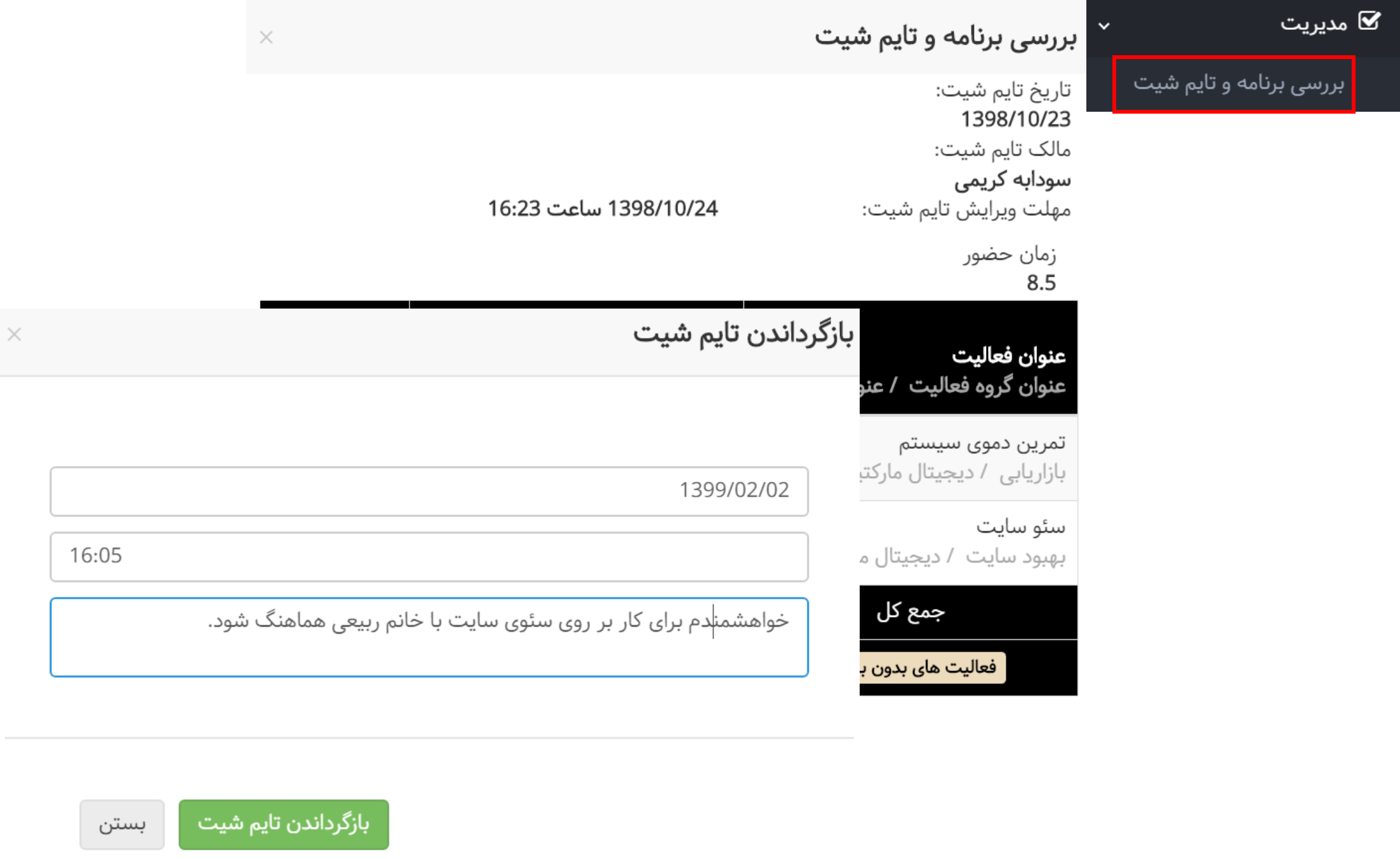در بهتایم قسمتی تحت عنوان بررسی و مدیریت تایمشیتها وجود دارد که با استفاده از آن مدیران میتوانند تایمشیت افراد مختلف را تایید و یا رد کنند و نظر خود را در ارتباط با تایمشیت آن روز فرد، به صورت خصوصی به اطلاع وی برسانند. با بررسی تایمشیت مدیر متوجه میشود که: