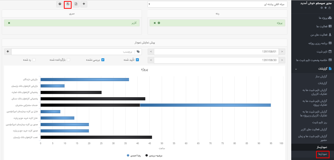 پس از ساخت نمودارهای مورد نظرتان با کلیک بر روی آیتم نشان داده شده در شکل بالا، آنها را در قسمت نمودارهای بهتایم از منوی گزارشات خواهید دید.