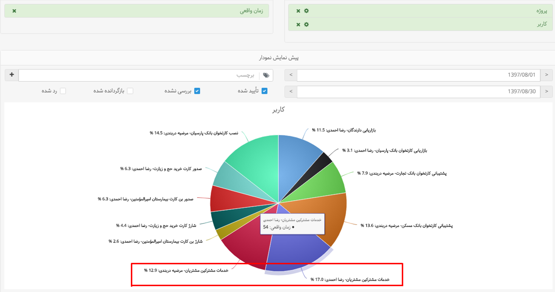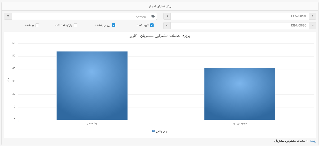 همانطور که مشاهده میکنید پروژه خدمات مشترکین مشتریان، توسط کاربران رضا احمدی و مرضیه دربندی انجام شده است و از ۹۵ ساعت کار صورت گرفته بر روی آن ۵۴ ساعت توسط رضا احمدی و ۴۱ ساعت توسط مرضیه دربندی انجام شده است.