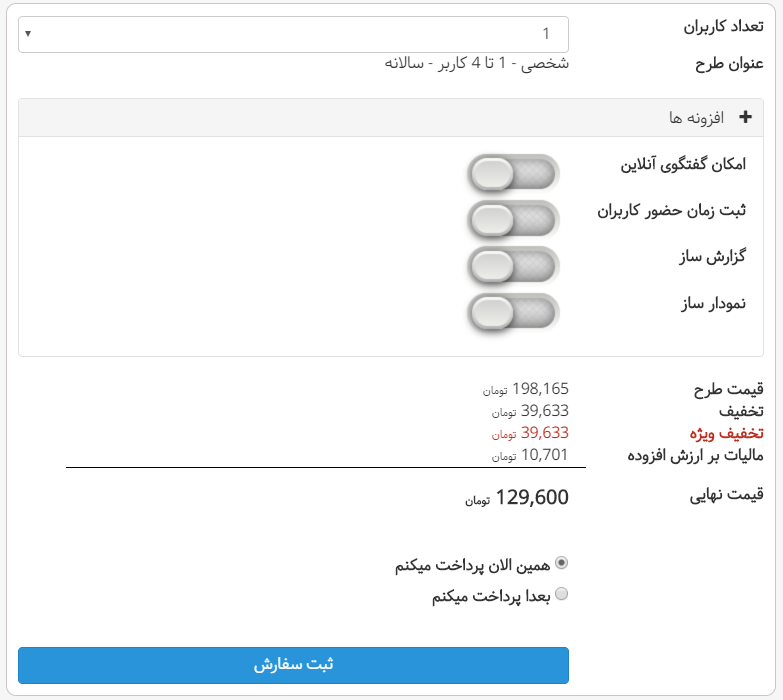 با مراجعه به پنل کاربری از قسمت کاربران در سایت بهتایم، وارد پنل کاربری خود شوید و با کلیک روی عبارت خرید یا تغییر لایسنس از منوی پنل خود وارد بخش تعرفههای بهتایم شوید. در این قسمت طرحهای ماهانه و سالانه در نظر گرفته شده است. پس از انتخاب طرح مورد نظر خود، روی عبارت خرید کلیک نمایید.