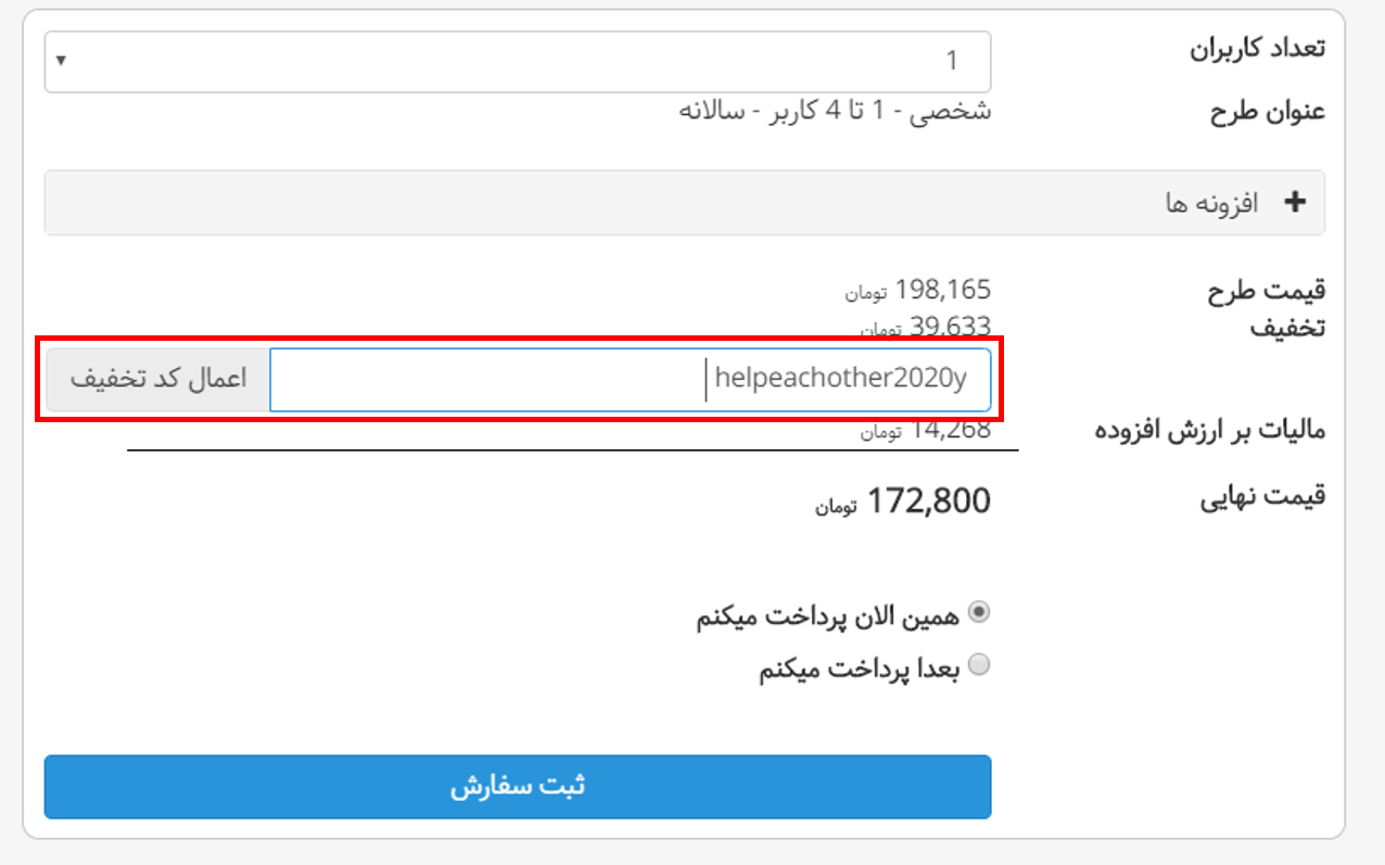 در این قسمت باید مانند شکل زیر کد تخفیف که برای طرحهای سالانه عبارت helpeachother2020y و برای طرحهای ماهانه عبارت helpeachother2020m است را در فیلد کد تخفیف وارد نمایید و بر روی عبارت اعمال کد تخفیف کلیک کنید.