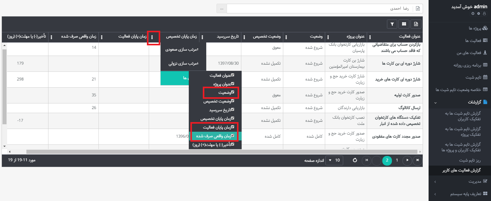 علاوه بر ستونهای نمایش داده شده شما میتوانید ستونهای دیگری را به گزارش خود اضافه نمایید. بدین صورت که با کلیک کردن روی علامت سه نقطه کنار عنوان هریک از ستونها و انتخاب عبارت «ستونها»، لیستی از عنوانها به شما نشان داده میشود، که شما میتوانید با انتخاب هریک، آنها را به گزارشتان اضافه کنید. به عنوان مثال میتوانید ستون «وضعیت»، «زمان پایان فعالیت» و «زمان واقعی صرف شده» را اضافه نمایید.