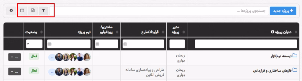 • از آیکن فیلتر برای جستجوی پروژه، بر اساس موارد مختلف استفاده کنید.