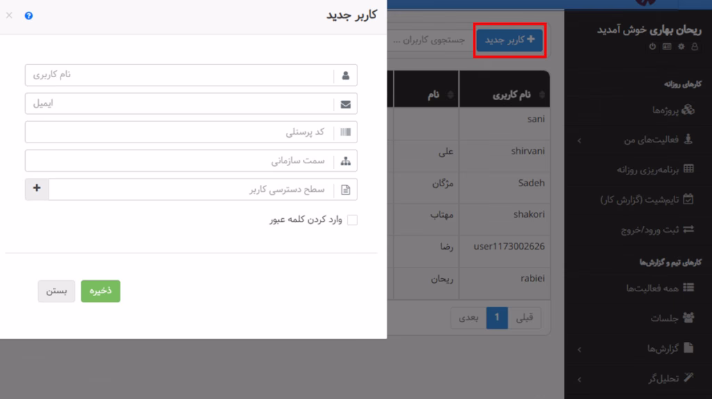 با انتخاب گزینهی + کاربر جدید، صفحهای مطابق شکل زیر به شما نمایش داده میشود و باید اطلاعات کاربر جدید از جمله نام کاربری، ایمیل و کد پرسنلی را در آن وارد کنید.