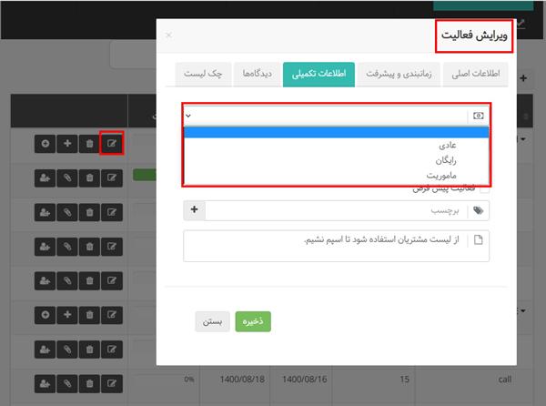 بعد از این باید نوع هزینه پروژهها و فعالیتها را مشخص کنید. توجه کنید که نوع هزینه فعالیت به نوع هزینه پروژه اولویت دارد. اگر فعالیت نوع هزینه داشته باشد، سیستم ابتدا آن را در نظر میگیرد و اگر نوع هزینه نداشته باشد، به نوع هزینه پروژه توجه میکند. برای مشخص کردن نوع هزینه پروژهها و فعالیتها به قسمت ویرایش و تب اطلاعات تکمیلی هر کدام مراجعه کنید.