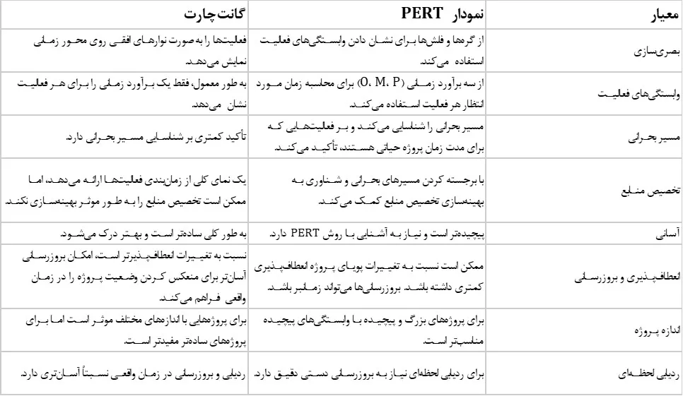 جدول زیر با هدف روشن کردن ویژگیهای متمایز نمودارهای PERT و Gantt تهیه شده است: